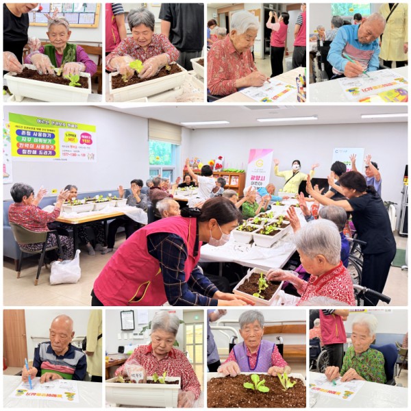 신나는 건강체조로 몸을 풀고, 오늘 심을 모종을 알록달록 색칠하며 설레는 마음을 나눴는데요. 드디어 시작된 모종 심기 시간! 어르신들은 고사리 같은 모종을 정성껏 심으며 "나중에 쌈 싸 먹자", "겉절이 하면 꿀맛이겠다"라며 벌써부터 수확의 기대감에 함박웃음을 지으셨습니다.