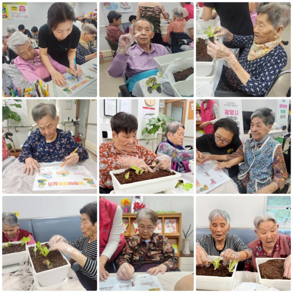 신나는 건강체조로 몸을 풀고, 오늘 심을 모종을 알록달록 색칠하며 설레는 마음을 나눴는데요. 드디어 시작된 모종 심기 시간! 어르신들은 고사리 같은 모종을 정성껏 심으며 "나중에 쌈 싸 먹자", "겉절이 하면 꿀맛이겠다"라며 벌써부터 수확의 기대감에 함박웃음을 지으셨습니다.
