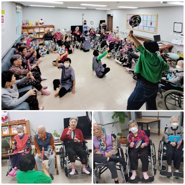 신나는 트로트 메들리에 맞춰 소고를 둥둥~ 두드리는 동안 요양원 안은 어르신들의 흥겨운 웃음소리와 북소리로 가득 찼는데요.